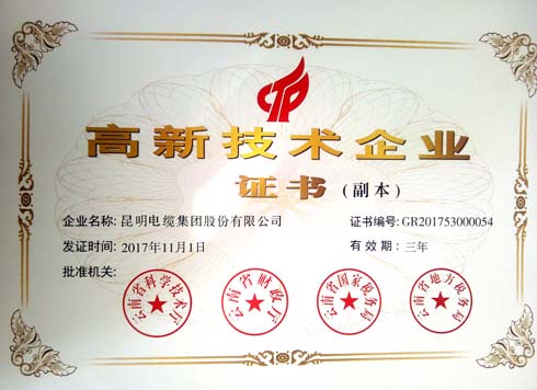 2017年12月,昆明電纜集團股份有限公司再次通過了高新技術(shù)企業(yè)的認定,被云南省科學技術(shù)廳、云南省財政廳、云南省國家稅務局、云南省地方稅務局認定為“高新技術(shù)企業(yè)”。